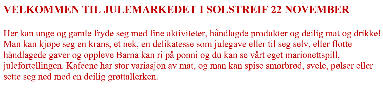 Velkommen til et alternativt barnehagetilbud En hverdag med rytmer, sanser og etterligning.Økologisk hjemmelaget mat på bordet.Et godt sted hvor barn får være barn. Våre barnehagerSolstreifVår barnehage i Drammen sentrumSolhagenVår barnehage på ÅssidenArrangementer Høstmarked i Solhagen 11 OktoberArrangementer Julemarked i Solstreif 22 november
